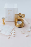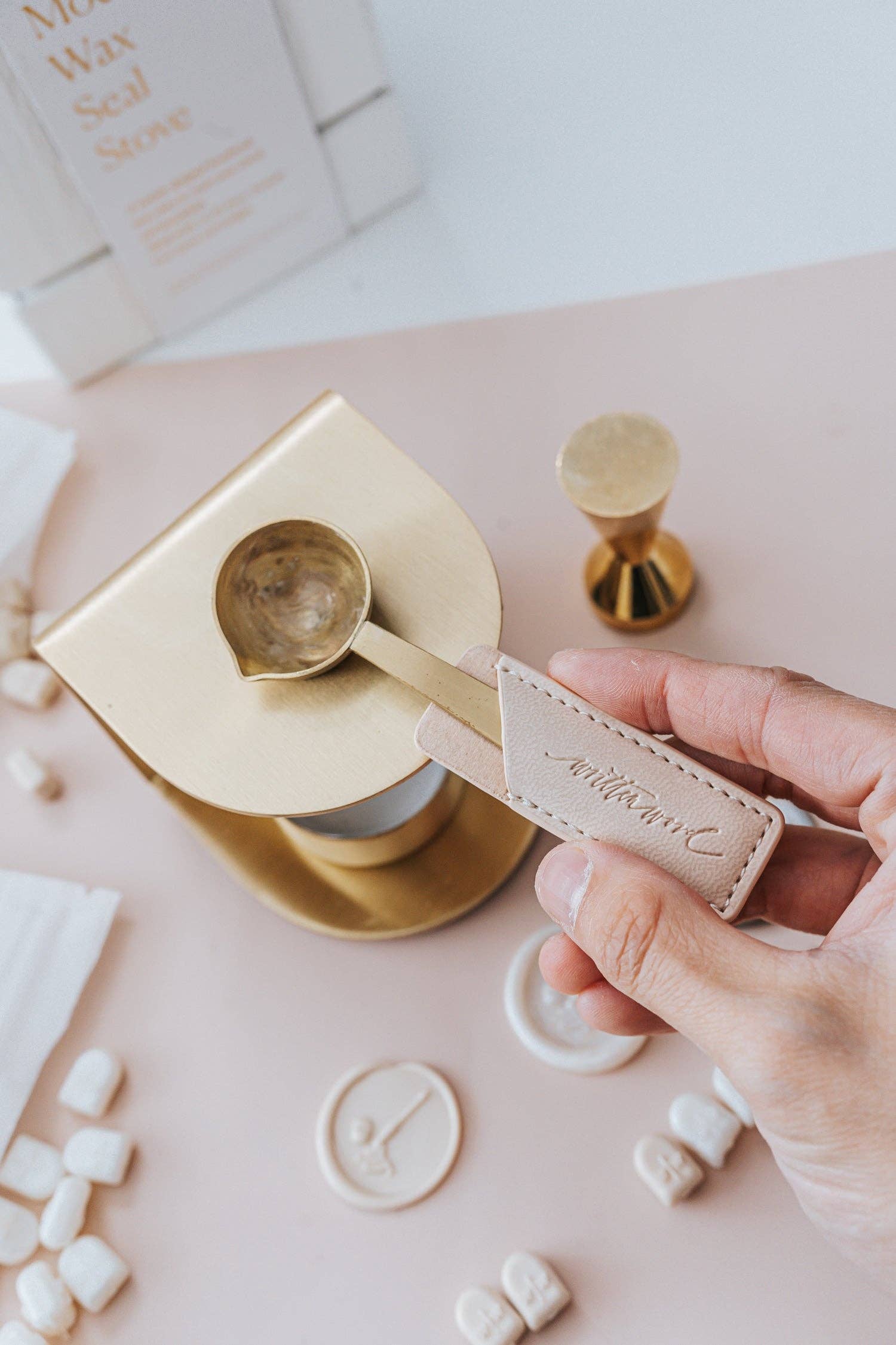 The brass melting spoon features a vegan leather heat-protective sleeve and the full set comes packaged in a luxury textured gift box, perfect for storage or gifting.