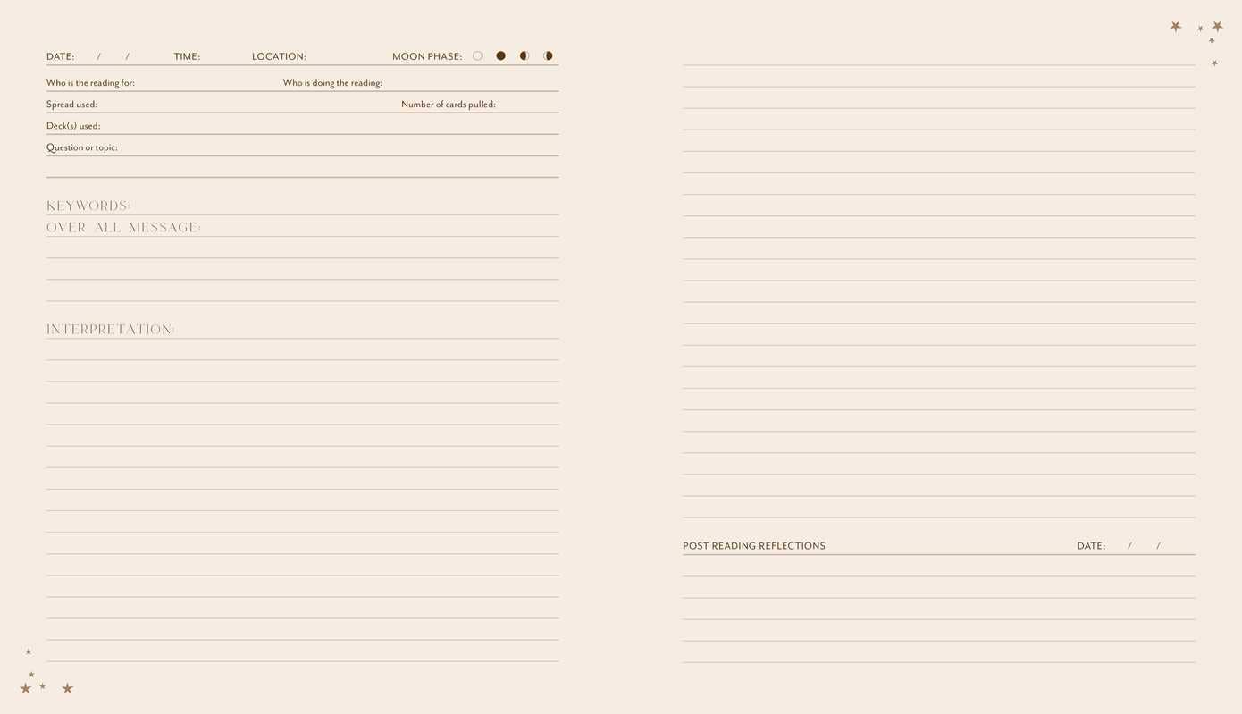 Whether you’re a beginner or a seasoned reader, this journal helps you keep a detailed record of your readings, track themes over time, and strengthen your intuitive connection.