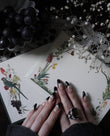 This set includes six A7 flat cards featuring a soft botanical landscape frame — perfect for letters, thank-you notes, invitations, journaling, or intentional correspondence. Each card is printed in a crisp four-color digital offset process on superfine cream white FSC-certified paper, giving every card a velvety, refined texture.