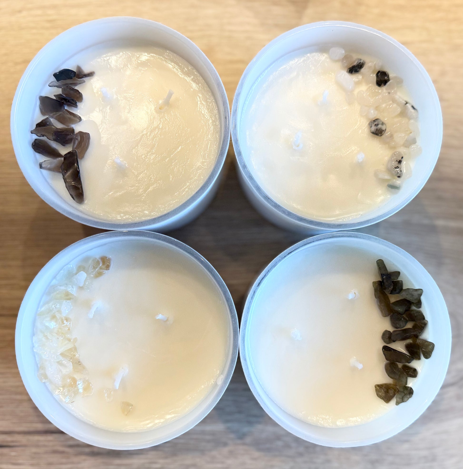 Poured in 16 oz glass vessels (12 oz wax fill) with a generous burn time of 60–70 hours, or in a 4 oz travel size (≈3 oz wax fill) perfect for on-the-go rituals and altars. Every candle is infused with intention, elemental balance, and a hand-selected crystal companion.