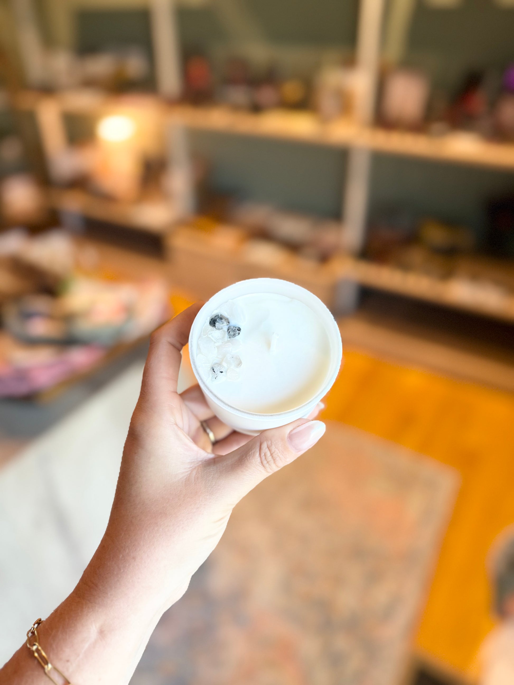 Poured in 16 oz glass vessels (12 oz wax fill) with a generous burn time of 60–70 hours, or in a 4 oz travel size (≈3 oz wax fill) perfect for on-the-go rituals and altars. Every candle is infused with intention, elemental balance, and a hand-selected crystal companion.
