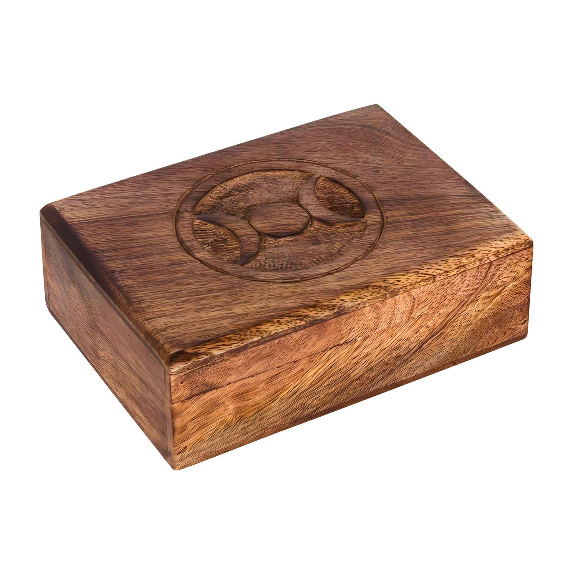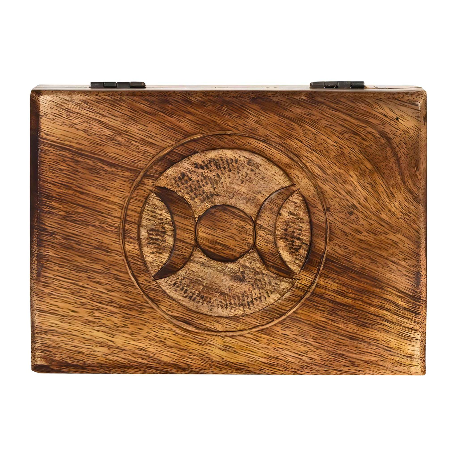 Crafted from rich, sustainable mango wood, this beautifully hand-carved hinged box features the powerful Triple Moon symbol—honoring the divine feminine, lunar cycles, and the sacred balance of Maiden, Mother, and Crone. Each box is a unique piece of craftsmanship, with natural wood grain and spiritual intention etched into every detail.