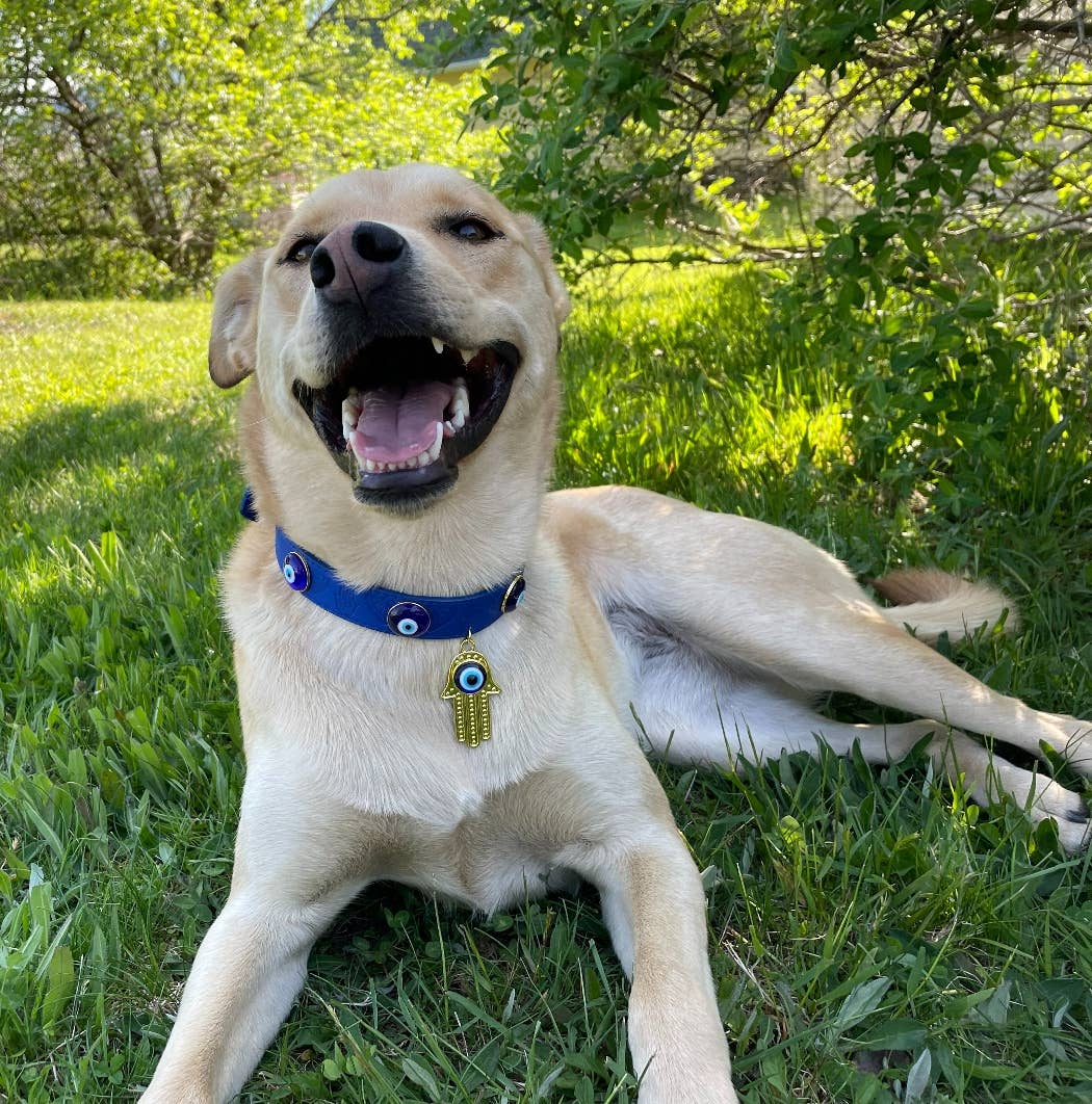 Keep your pup stylish and spiritually protected with this vegan leather dog collar, adorned with evil eye gems and a symbolic Fatima hand charm. Known as talismans of protection, these charms are believed to ward off negativity and attract positive energy—making this more than just a collar, but a protective amulet for your four-legged friend.