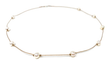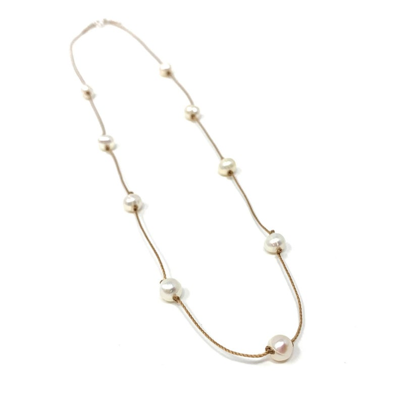 The cord is crafted from heat-set nylon thread, offering both strength and resistance to fraying while remaining thin, lightweight, and almost invisible. This creates the illusion that the pearls are delicately floating on the neckline. A sterling silver clasp completes the design with refined detail.
